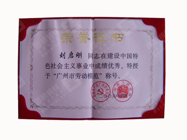 廣州市委、市政府授予劉啟剛同志廣州市勞動(dòng)模范榮譽(yù)證書